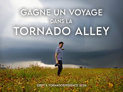 Pour fêter les 100 000 abonnés sur la chaîne YouTube de CØDY, nous allons offrir à l'un d'entre vous un voyage exceptionnel dans la Tornado Alley. Avec TornadoXperience, vous allez vivre l'expérience chasseur d'orages dans les grandes plaines américaines, à la rencontre des plus violents orages de la planète ! Tirage au sort : janvier 2026.